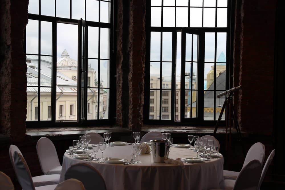 Наш самый большой и внушительный зал площадью 140 м.кв. с 9 окнами, открывающими восхитительный панорамный вид на Старую Площадь, соборы Кремля, улицы Маросейка и Ильинка.